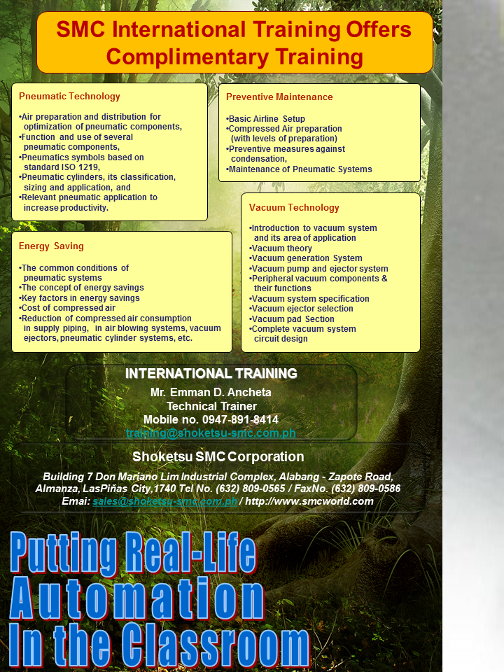 For reservation, please contact the Sales Support Department, Training Division at +63 (02) 809 0565 local 52 or email training@shoketsu-smc.com.ph