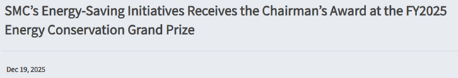 Các hoạt động tiết kiệm năng lượng tại nhà máy của SMC hướng tới mục tiêu giảm phát thải khí nhà kính (GHG) với chủ đề “Thách thức trong việc giảm tiêu thụ khí nén: Khử carbon thông qua thiết bị tiết kiệm khí và Giảm áp suất khí trong nhà máy” đã xuất sắc giành Giải thưởng “The Energy Conservation Center, Japan (ECCJ) Chairman’s Award” trong hạng mục Best Practice tại Giải thưởng Tiết kiệm Năng lượng năm 2025. Quyết định trao giải xem tại đây (Tiếng Nhật)