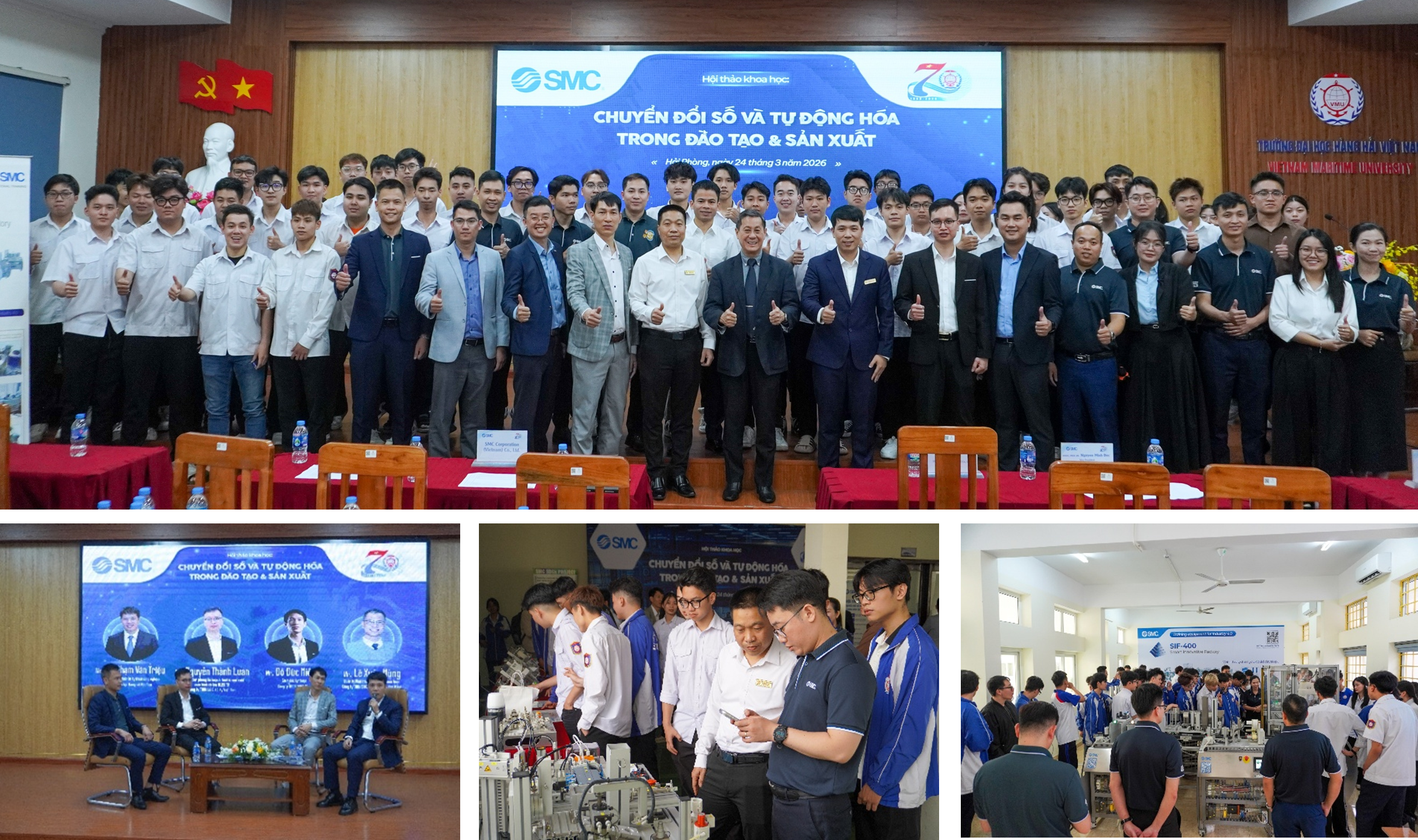 SMC Việt NamFrom Training to Manufacturing: Digital Transformation & AutomationNgày 24/03/2026, SMC Corporation Việt Nam đã phối hợp cùng Trường Đại học Hàng hải Việt Nam tổ chức thành công hội thảo “Chuyển đổi số và Tự động hóa trong đào tạo và sản xuất” nhân dịp kỷ niệm 70 năm thành lập Nhà trường (1956-2026). Sự kiện không chỉ là dịp gặp gỡ, kết nối mà còn mở ra không gian trao đổi cởi mở giữa doanh nghiệp, nhà trường, chuyên gia và sinh viên về những xu hướng đang định hình tương lai ngành kỹ thuật. Tại hội thảo, các chia sẻ từ SMC đã mang đến góc nhìn thực tiễn về công nghệ, những thách thức doanh nghiệp đang đối mặt cũng như định hướng ứng dụng vào đào tạo. Đặc biệt, các mô hình nhà máy thông minh và hệ thống tự động hóa được giới thiệu trực quan, giúp rút ngắn khoảng cách giữa kiến thức học thuật và môi trường sản xuất thực tế. Xem chi tiết về hội thảo tại đây |